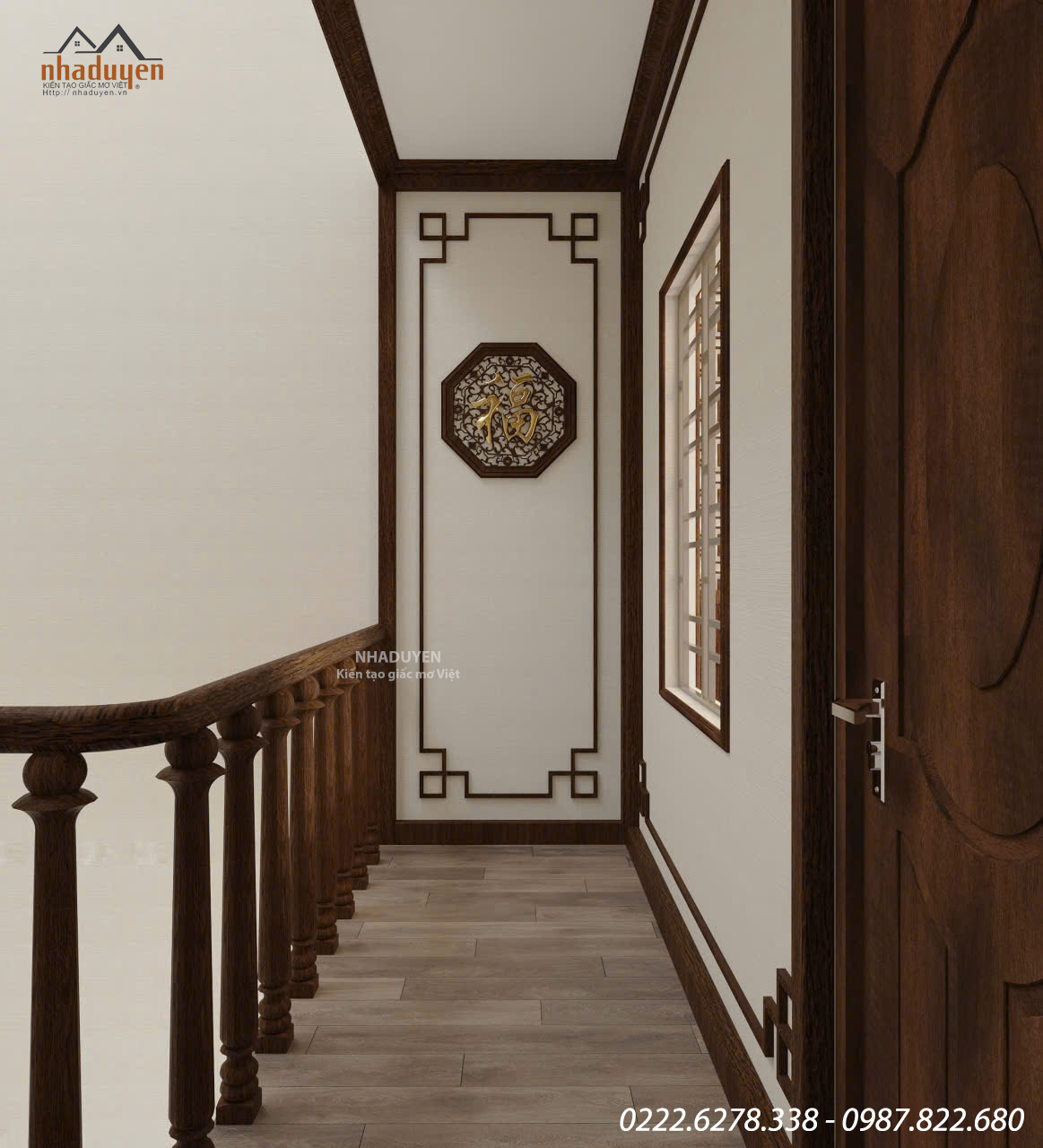 Mảng tường nhấn bằng họa tiết nan gỗ và phù điêu tròn tinh xảo. Ánh sáng vàng nhẹ mang lại cảm giác trang trọng. Bố cục cân đối, thể hiện sự tinh tế trong từng chi tiết.