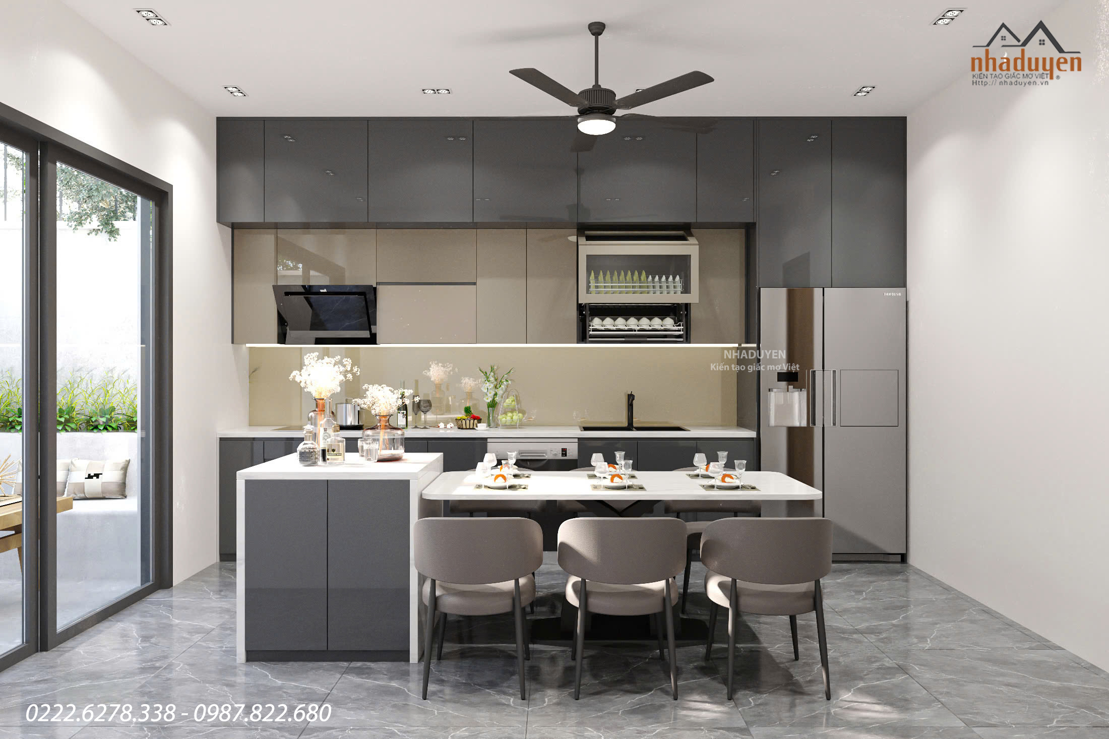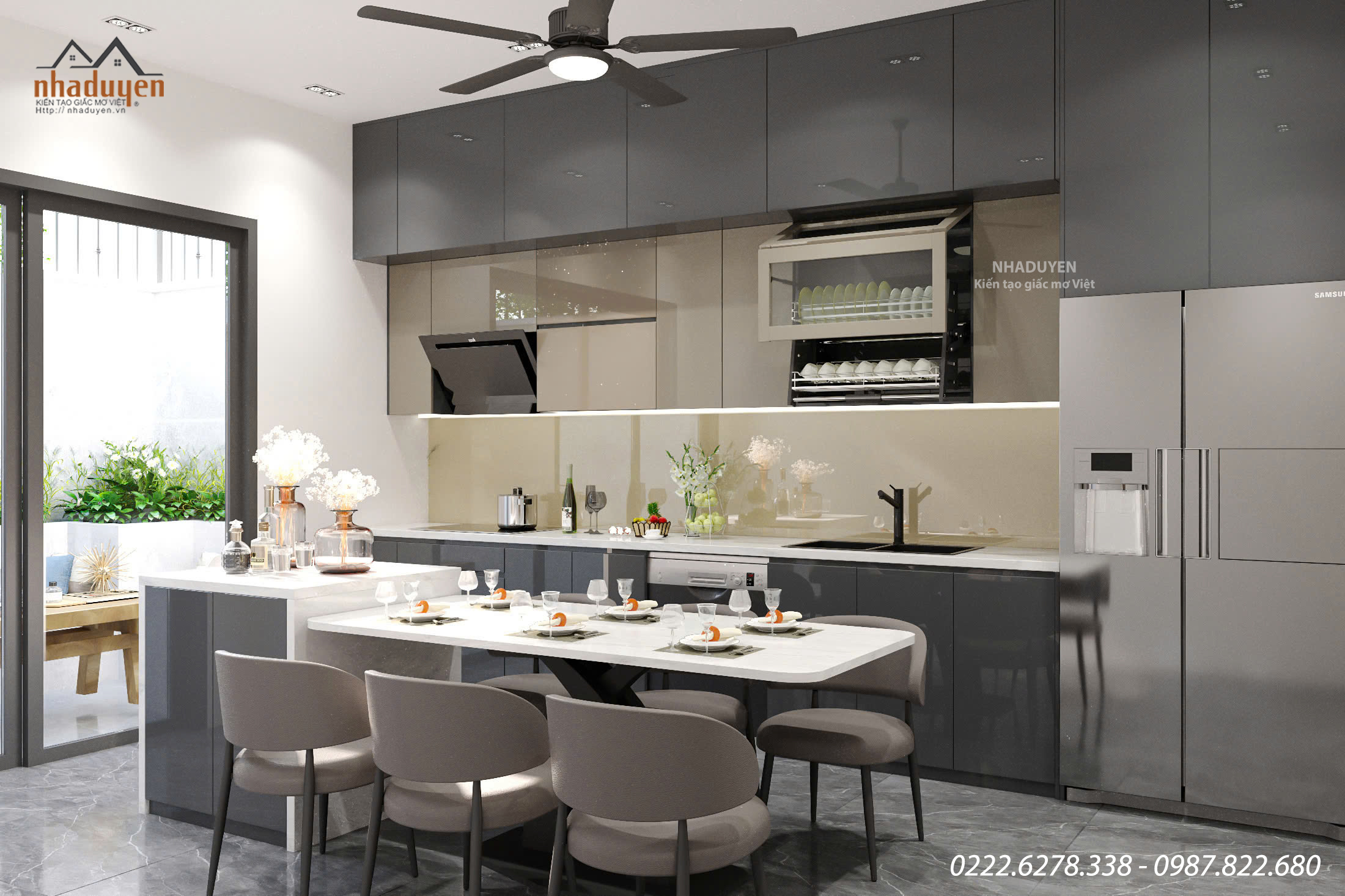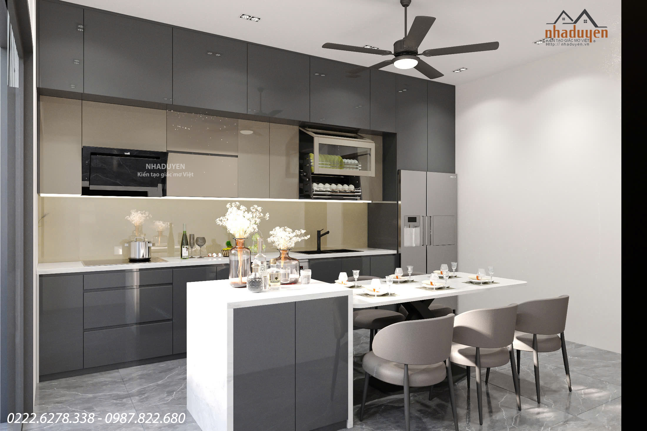 Không gian bếp được thiết kế theo phong cách tối giản hiện đại: Hệ tủ bếp màu ghi xám thời thượng, chạy kịch trần giúp tối ưu diện tích lưu trữ.