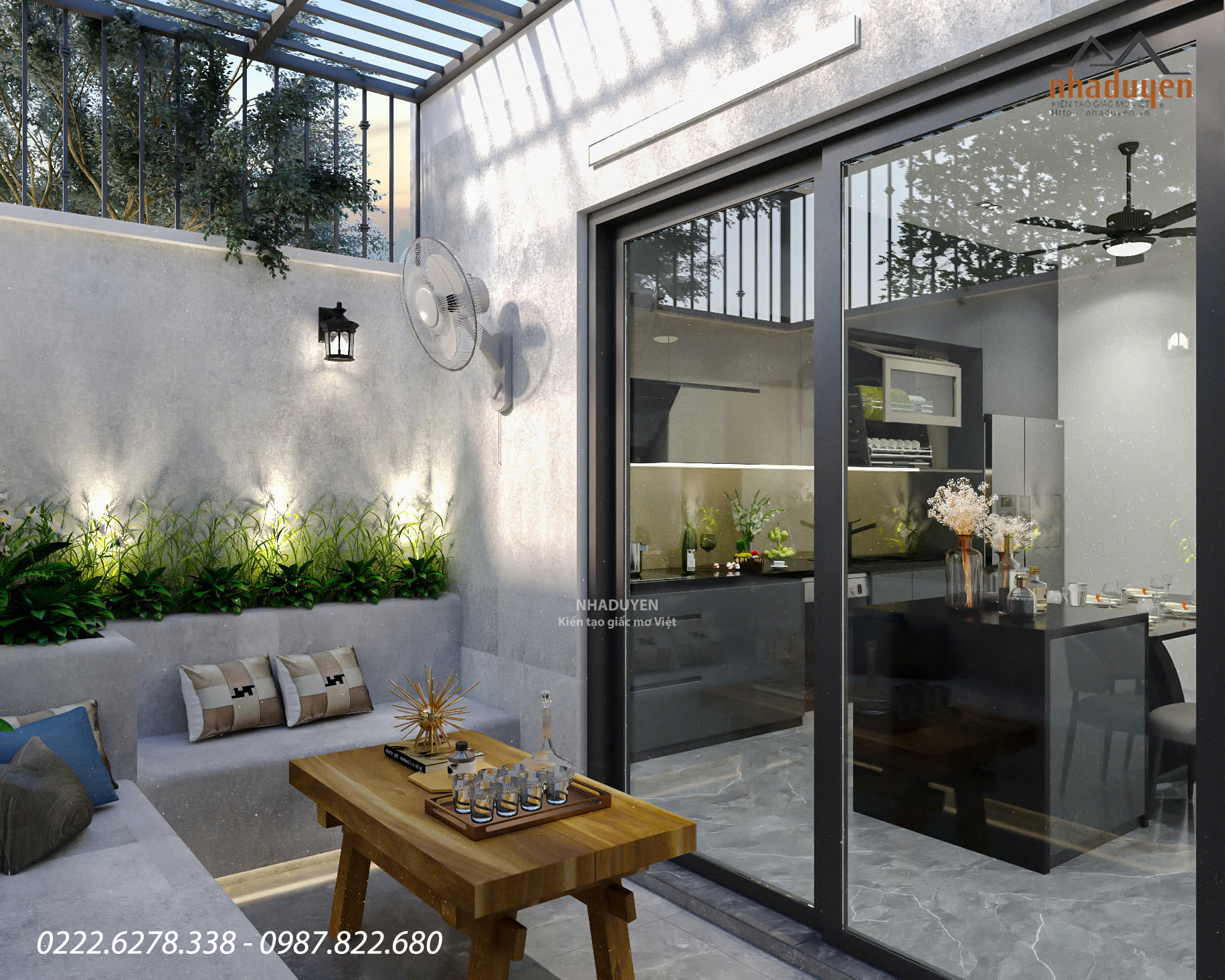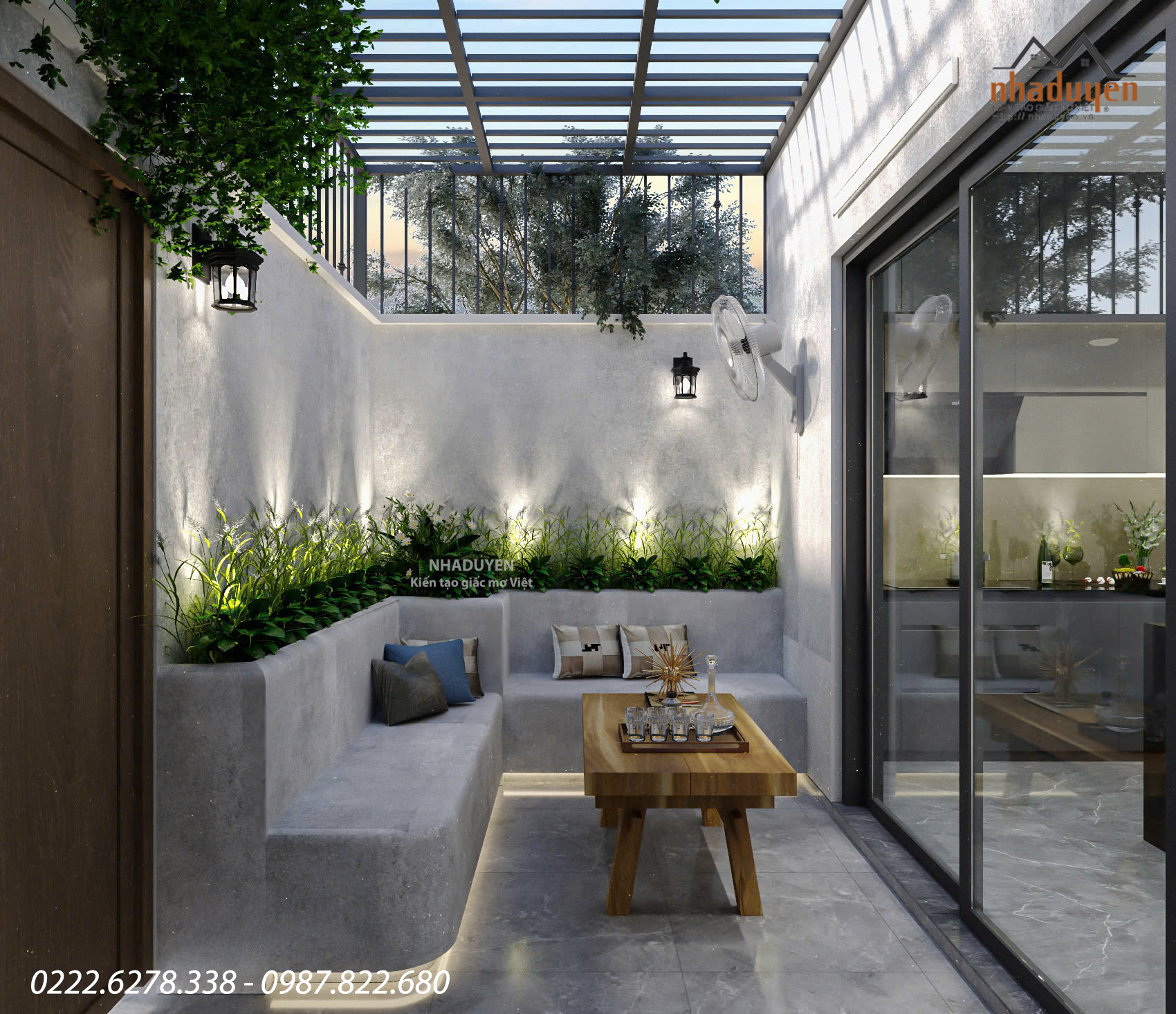 Thiết kế sân nhỏ theo phong cách tối giản nhưng đầy cảm xúc: Ghế bê tông liền khối bo cong mềm mại. Hệ cây xanh kết hợp đèn hắt tường tạo điểm nhấn sinh động khi chiều buông. Bàn gỗ mộc mạc làm nổi bật sự ấm áp giữa nền tường xám hiện đại.